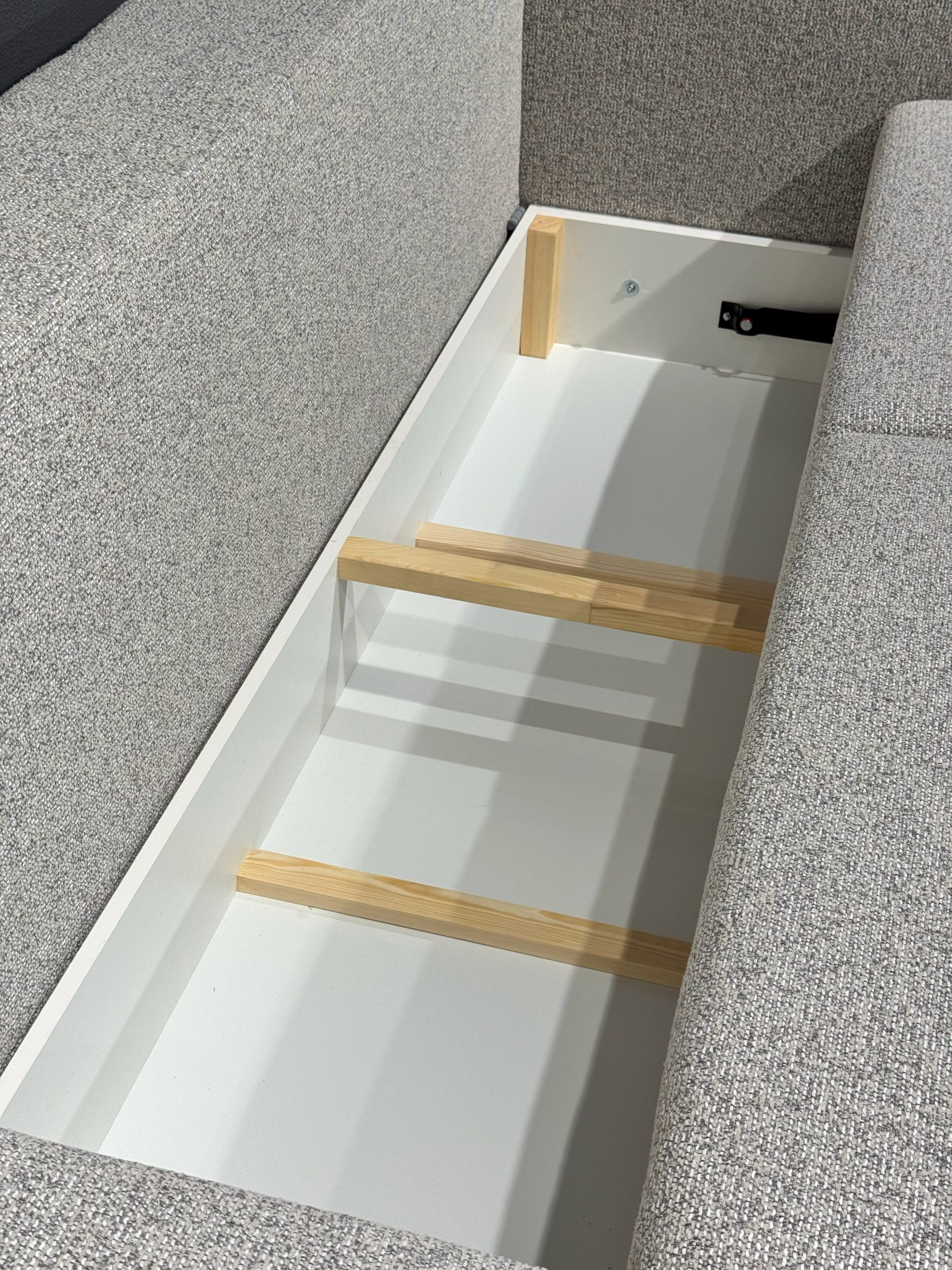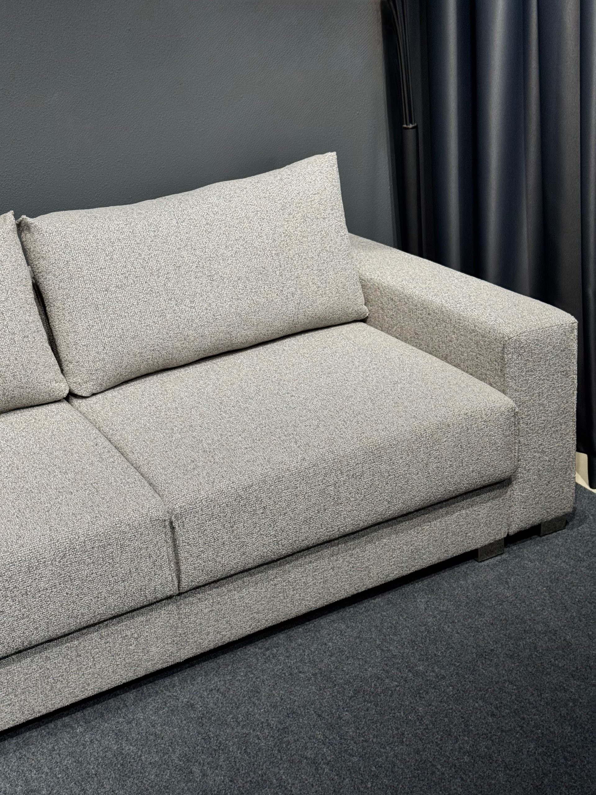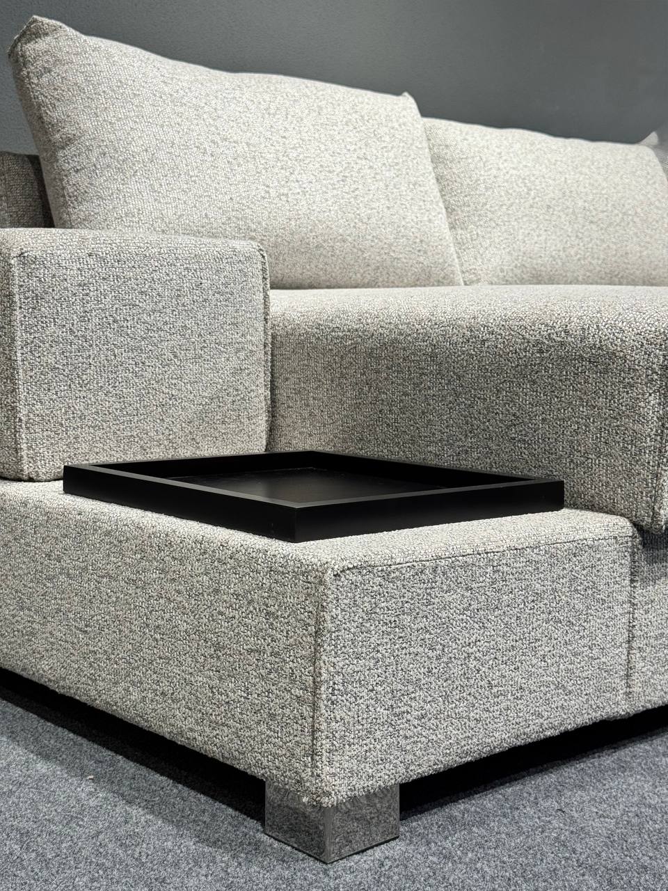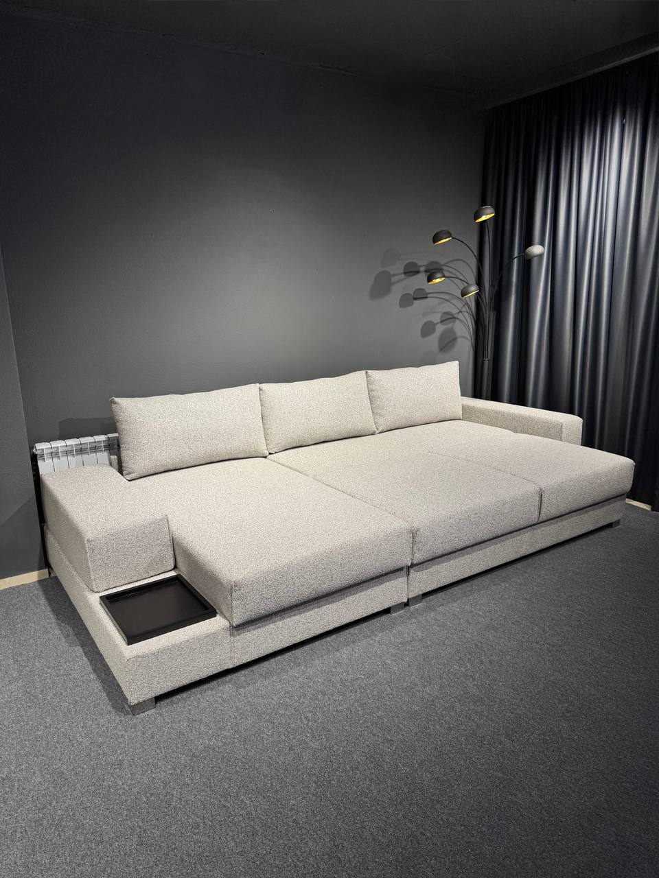 Лаконічний кутовий диван у світло-бежевому відтінку — це ідеальне поєднання функціональності та естетики. Його геометричні лінії, глибоке сидіння й текстурна тканина створюють вишуканий, але водночас затишний настрій.Практична деталь — вбудована ніша-поличка, яка додає зручності у повсякденному використанні.