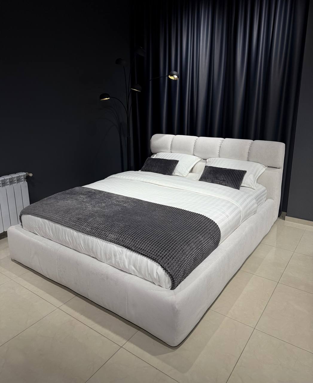 Стильне двоспальне ліжко з м’яким узголів’ям — ідеальне поєднання комфорту та сучасного дизайну. Оббивка виконана з приємної на дотик світлої тканини, яка додає інтер’єру ніжності та елегантності. Узголів’я з вертикальними прошивками створює ефект об’єму та затишку, забезпечуючи зручну опору під час відпочинку або читання.