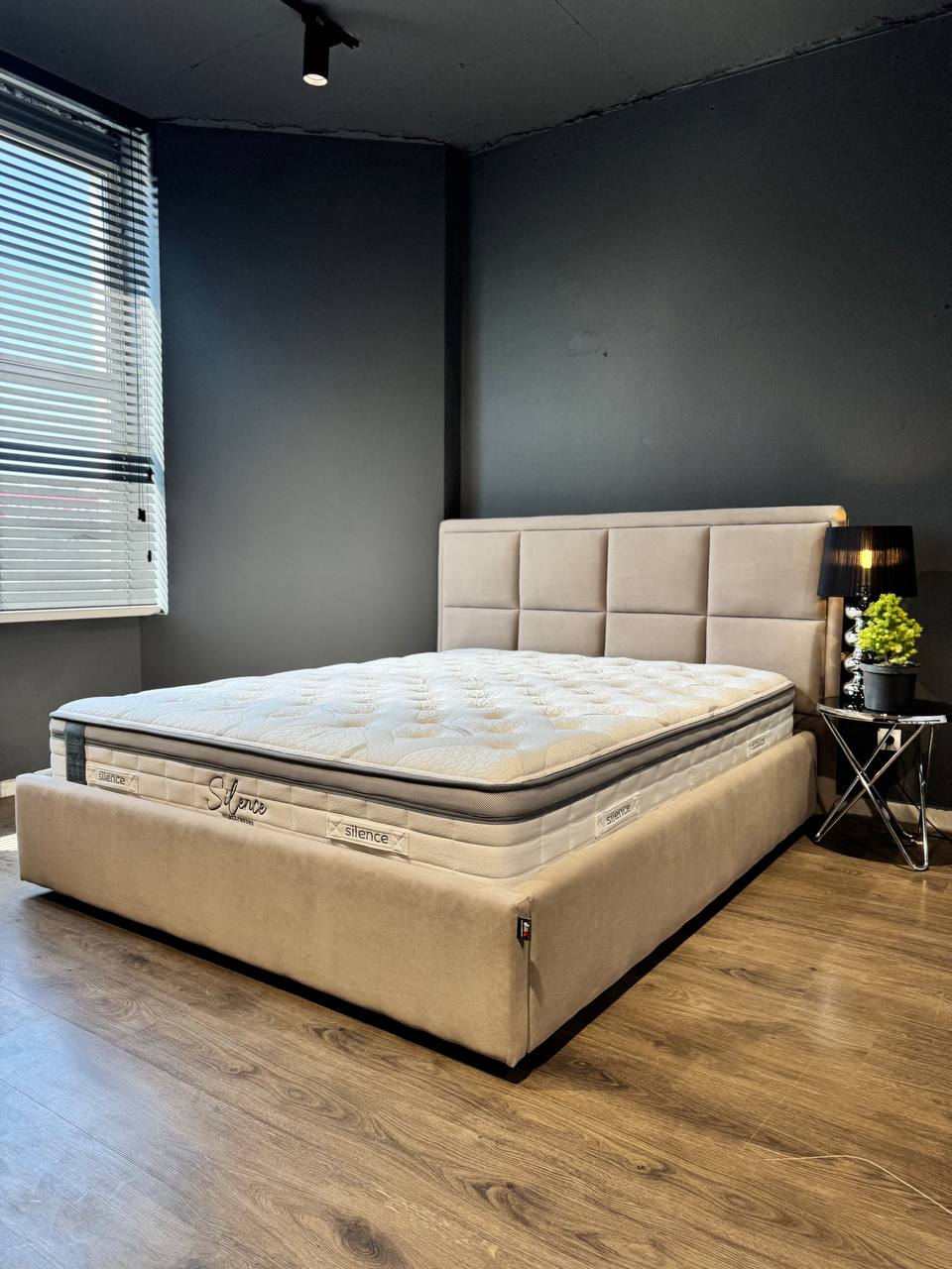 Сучасне ліжко з лаконічним дизайном та акцентом на комфорт. М’яке узголів’я з великими прямокутними секціями створює стильний геометричний ритм і забезпечує зручну опору для спини. Оббивка виконана зі світло-бежевої велюрової тканини — приємної на дотик, з легкою матовістю, що додає інтер’єру тепла та затишку.