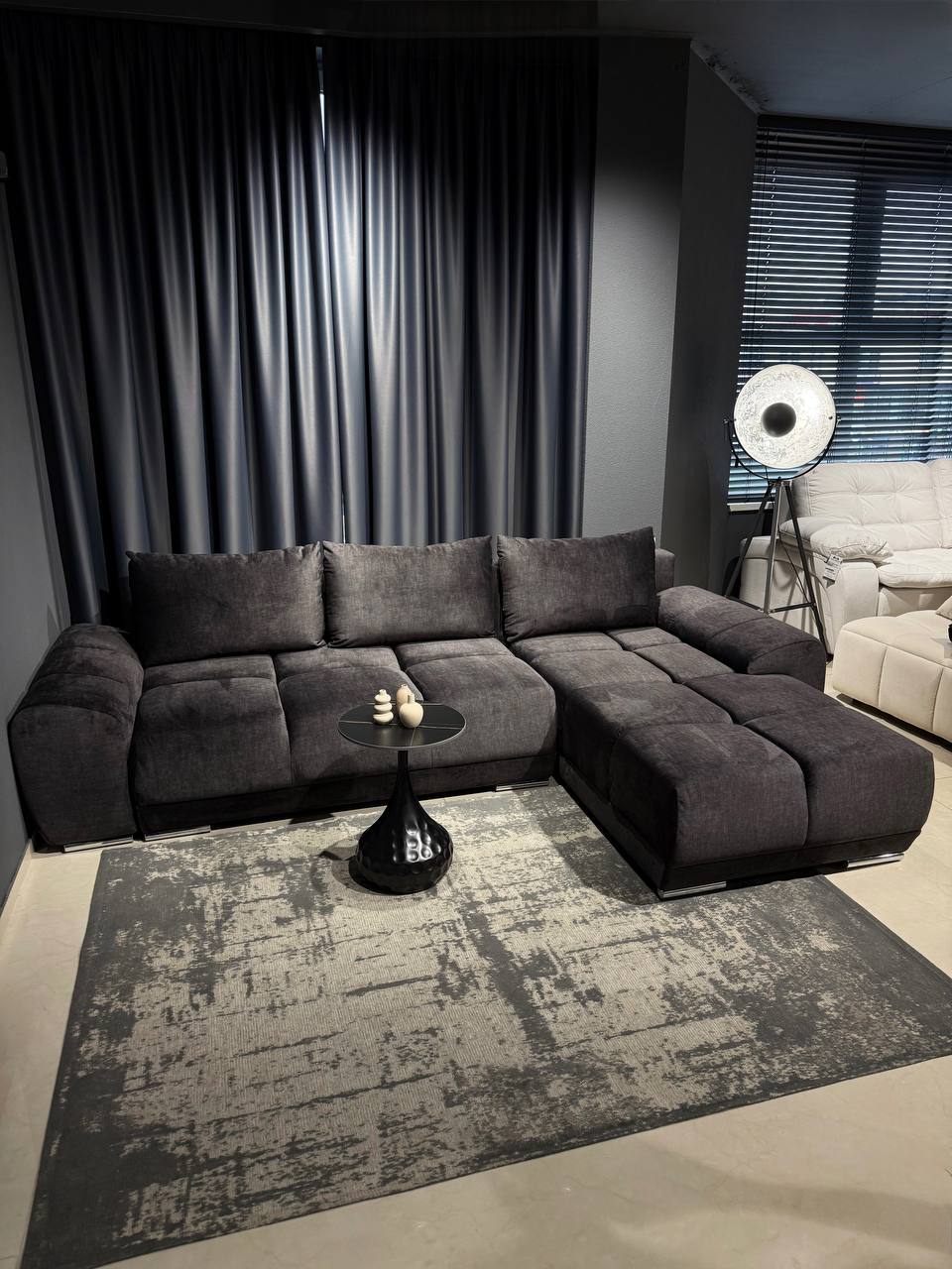 Сучасний кутовий диван у глибокому графітовому відтінку.Стильний кутовий диван із глибокою посадкою — ідеальне поєднання мінімалізму, комфорту та преміальної естетики. Лаконічний дизайн із м’якими геометричними формами гармонійно доповнить сучасний інтер’єр у стилі модерн, лофт або мінімалізм.Широкі сидіння з глибокою прошивкою забезпечують максимальний комфорт для відпочинку, а місткий кутовий модуль дозволяє зручно розміститися великою компанією або насолодитися затишним вечором наодинці. Якісна зносостійка оббивка приємна на дотик і довго зберігає бездоганний вигляд.Низька платформа та масивні підлокітники додають дивану солідності та сучасного характеру. Це ідеальний вибір для просторої вітальні, де цінується стиль, комфорт і функціональність.Переваги: