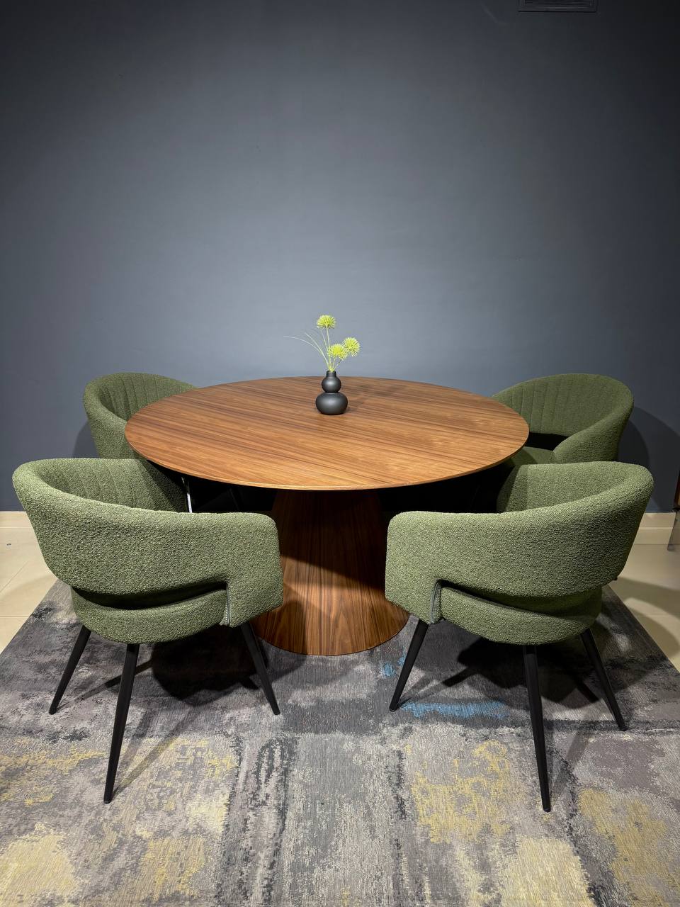 Круглий стіл із натурального шпону горіха створює теплу, затишну атмосферу, а оливкові крісла додають інтер’єру елегантності та м’якості.