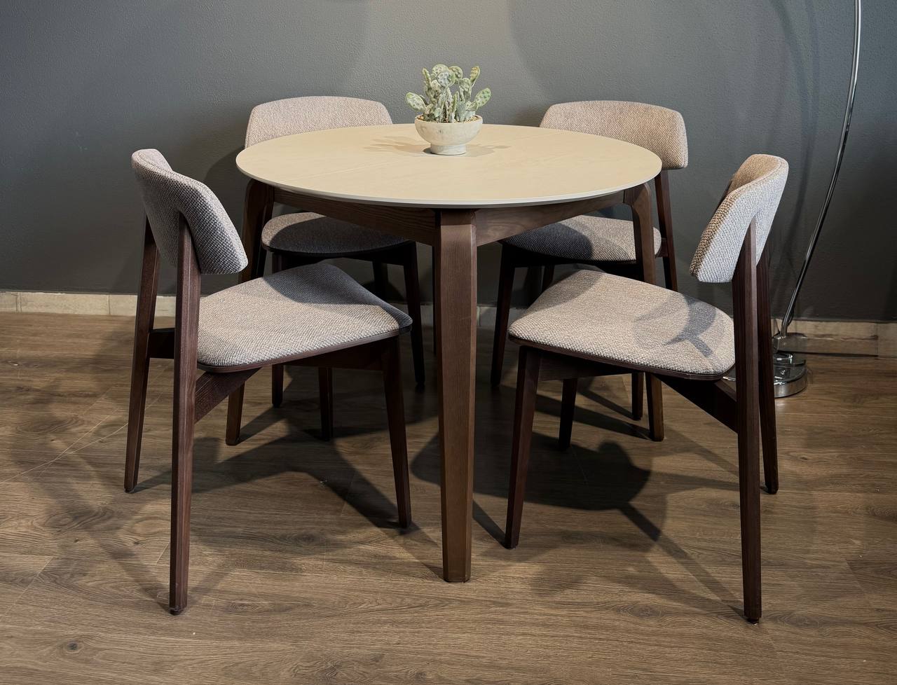 Сучасний обідній комплект, створений для тих, хто цінує комфорт і стиль. Круглий розскладний стіл із дерев’яними ніжками та світлою стільницею надає інтер’єру легкості та затишку. М’які стільці з ергономічною спинкою та тканинною оббивкою забезпечують максимальний комфорт під час сидіння. Завдяки поєднанню натуральних відтінків та елегантного дизайну комплект гармонійно впишеться як у сучасний, так і в класичний інтер’єр.